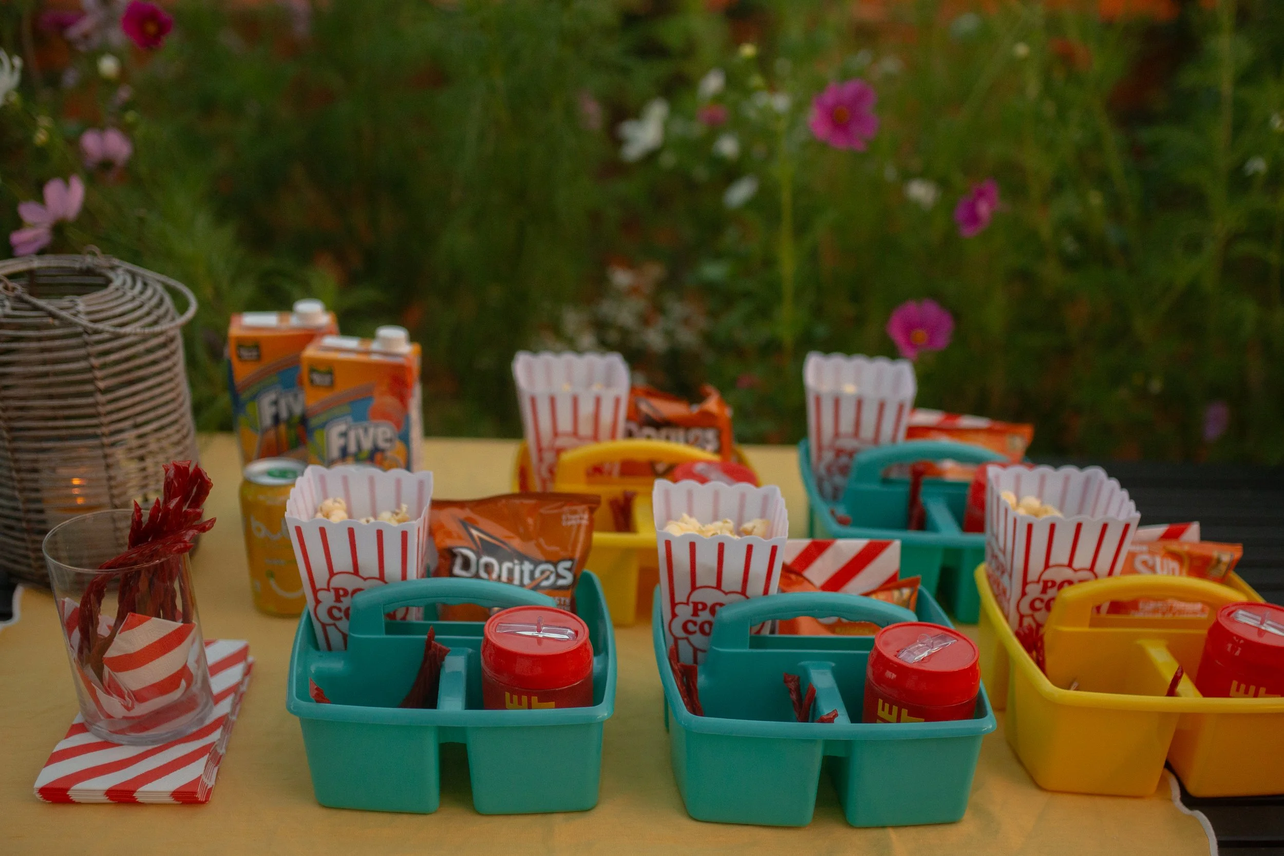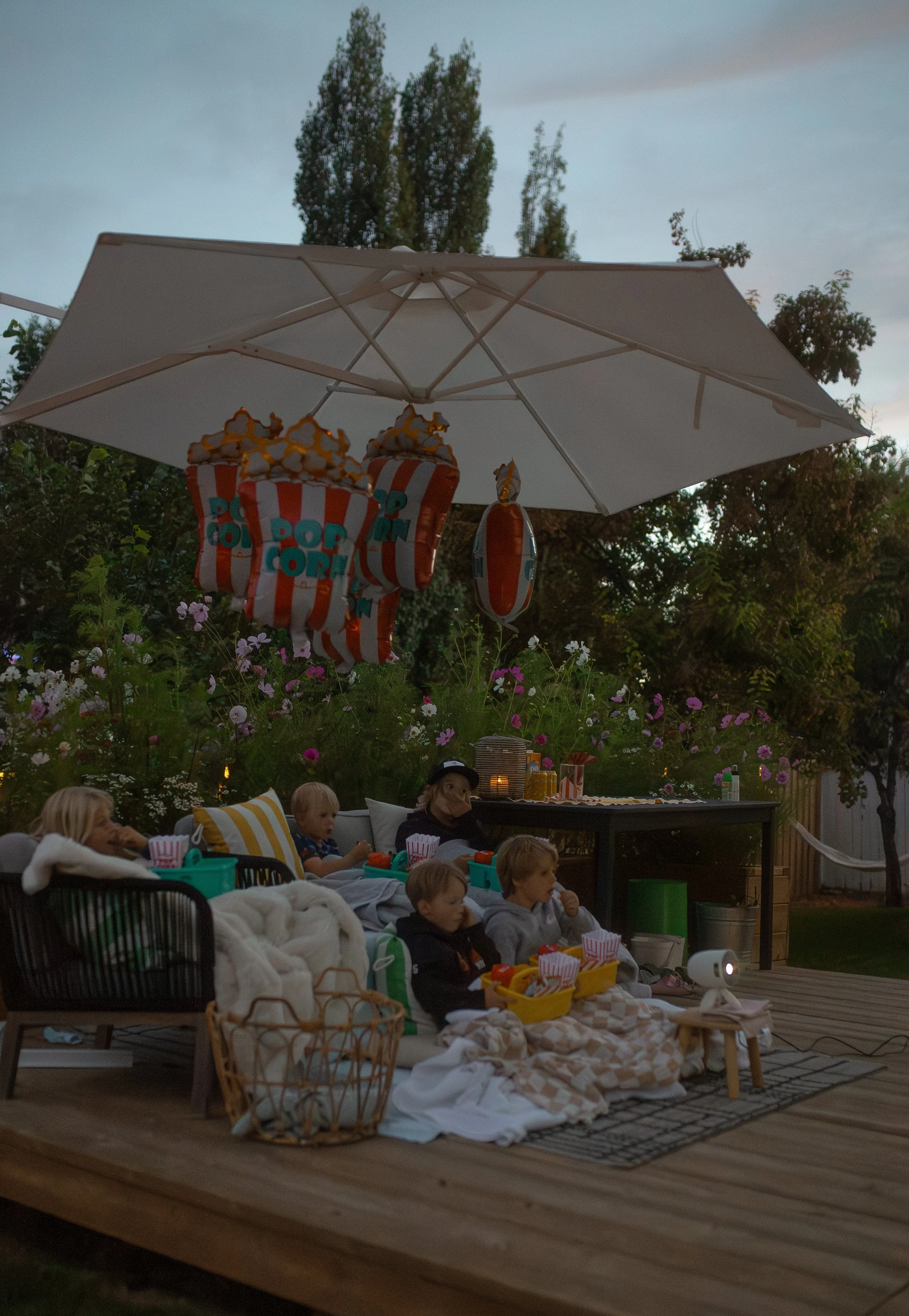 I wanted to create a cozy setup - so I brought down our outdoor sofa and chairs to our lower deck, and hung a screen on the wall of our house across from it. I hung these cute foil popcorn balloons under the umbrella, and set out lots of blankets and pillows! Snacks are obviously the most important of a good movie night, so I decided to put together a little snack caddie for each of the kids. I found these caddies at dollarama, and added a popcorn bucket, bag of chips and candy to each one. Then I found these adorable red tumbler cups and added a yellow “movie night” decal using my cricut. I love that their was even a spot for the drink in the caddie (and a spill-proof top!) so that everyone’s could be safely stowed durning the movie.