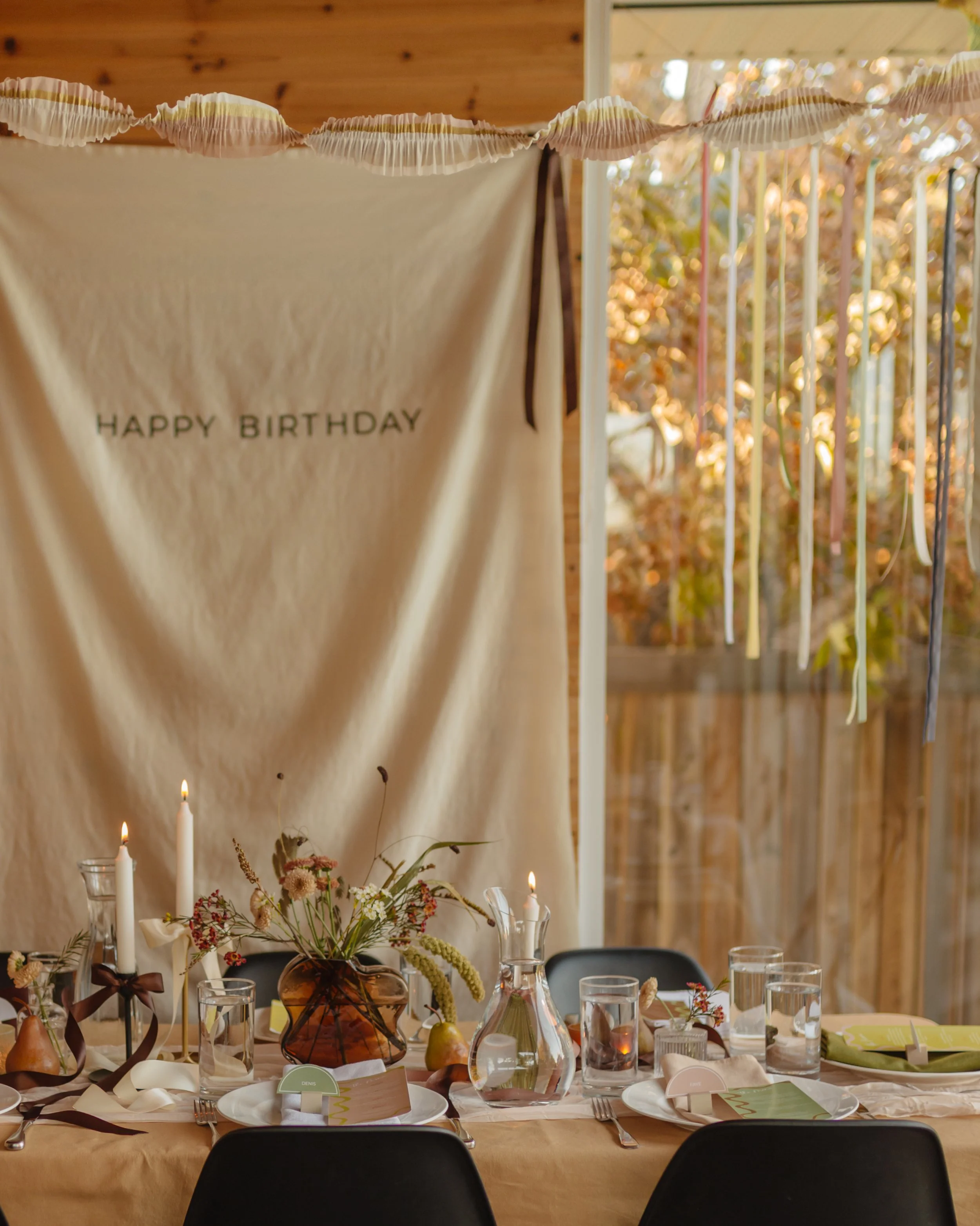 For overall decor in the sunroom, I hung streamers (i used this tutorial to make ruffled layered ones!), a velvet ribbon garland, and a simple “happy birthday” banner that I made from a piece of thrift store fabric and iron-on vinyl!