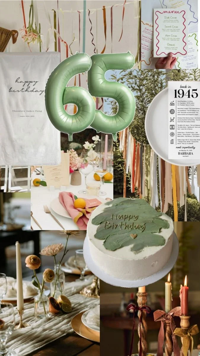 First thing I did was hit pinterest looking for 65th birthday inspo…and trust me when I say, there wasn’t much to be found! Instead, (just as I do for kids’ parties) I focused my search on the overall vibe and colour scheme I wanted to achieve. From there - I started saving images that I liked and created a mood board to get the ball rolling. Here’s what I originally put together on pinterest (did you know you can make collages right in the pinterest app? so quick and easy)