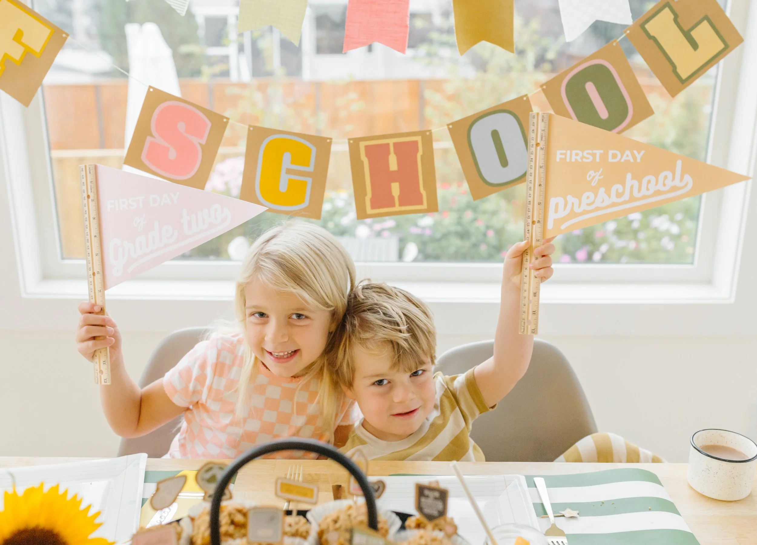 I can’t believe summer is over and we’re headed back to school! This time was extra fun with Ethan starting preschool, so it was fun for him to finally be a part of the first day excitement too! Every year since Lauren began Kindergarten, I have set up a little breakfast party the night before, and prepped an easy breakfast that I just have to set out once the kids wake up. I feel like having a special breakfast together eases the nerves a bit by spending time together and making sure they eat a good breakfast! (and helps me be more organized and prepared too!) This year I was so excited to use these super cute paper backpack treat bags from A Little Confetti - I packed them up with the little stickers they came with for the kids to decorate, as well as some fun school supplies and goodies!