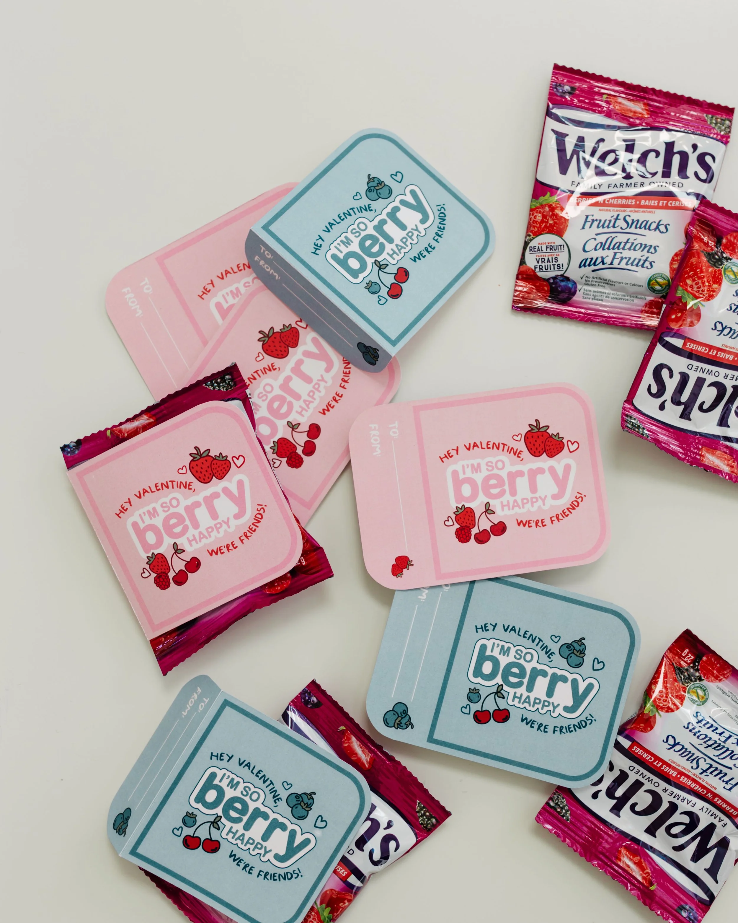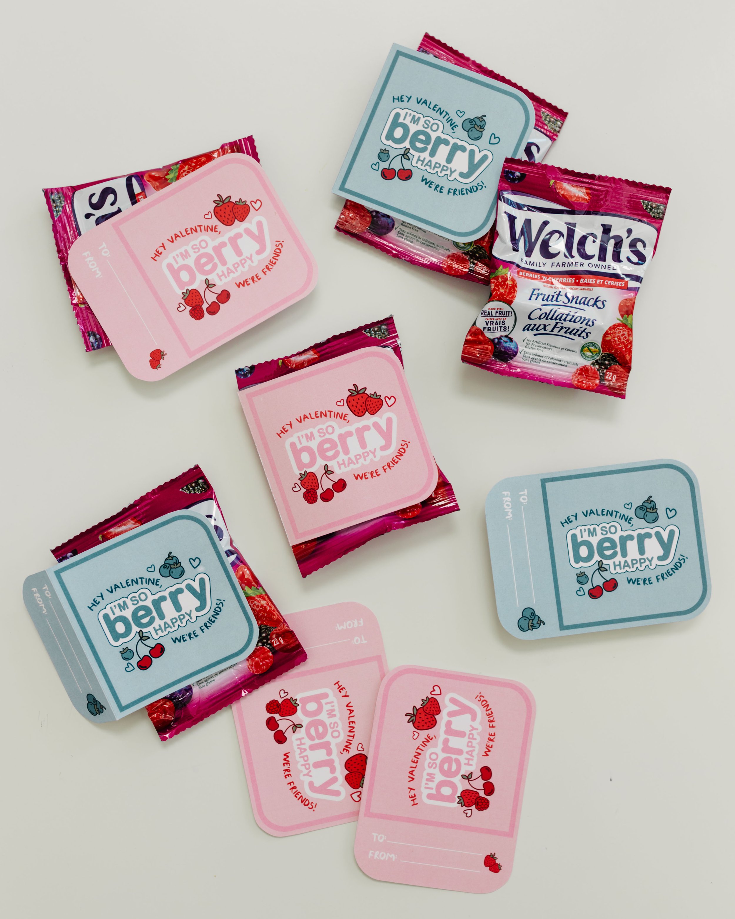 The easiest last-minute valentines ever! Click the link below to download your own BERRY printable valentine cards! Print on 8.5”x11 paper (recommend 100lb matte cardstock), and cut out each card. Fold, and use hot glue or double-sided tape to attach to your favourite fruit snack! (these welch’s “berries ‘n cherries” packs were perfect!)